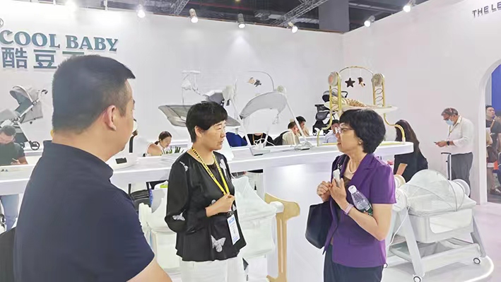 中國玩具協(xié)會會長梁會長也到場參觀了酷豆丁嬰兒床、嬰兒車等產(chǎn)品,并與酷豆丁董事長張迎年女士針對產(chǎn)品目標(biāo)群體、使用場景等話題展開了交流。