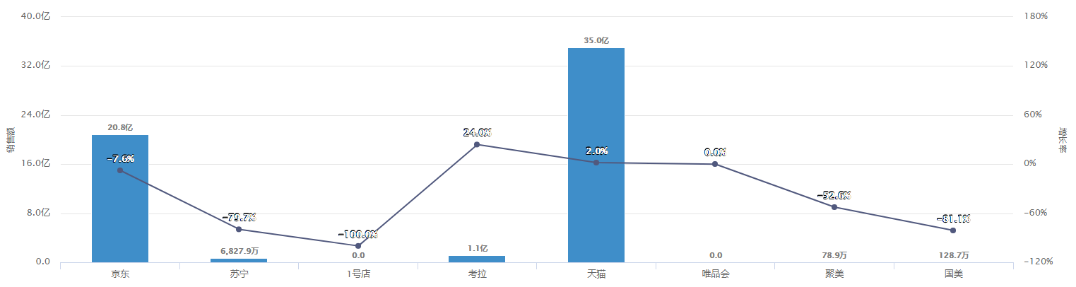 通過觀察上圖,我們可以看到,在嬰兒出行相關(guān)類目上,天貓規(guī)模達(dá)35億,占比超過半數(shù),是第二大平臺京東的1.7倍,優(yōu)勢明顯,增幅在2.0%。反觀其他平臺,2018年京東嬰兒出行線上銷售額為20.8億,位列第二,增速為-7.6%;其次是考拉,雖規(guī)模只占到了1.1億,但其24%的增速尤為引人注目,未來的想象空間巨大;蘇寧2018年嬰兒出行線上銷售額為6827.9萬,份額不多,銷售額下滑達(dá)79.7%。